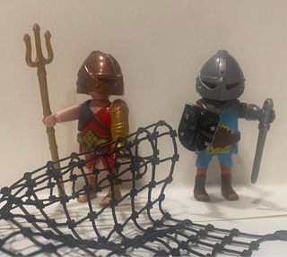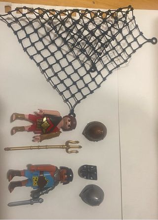 Set de figuras de Playmobil de gladiadores. - Incluye dos figuras de gladiadores. - Una figura porta un tridente. - La otra figura lleva escudo y espada. - Accesorios de armadura y casco.