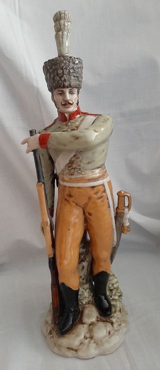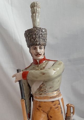 Figura de porcelana esmaltada de Salvador Mallol. representa soldado del ejercito de epoca, con armas, espada y fusil. Detalles plateados como la espada y dorados. Buen estado, salvo el adorno del sombrero, según se aprecia en la ultima foto. 30 cm alto.