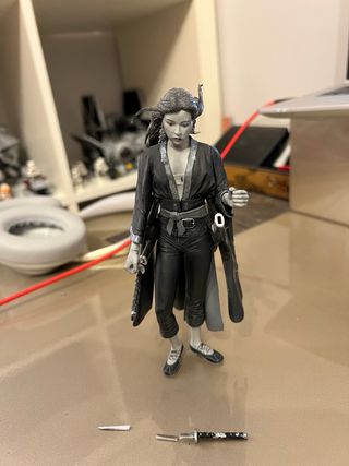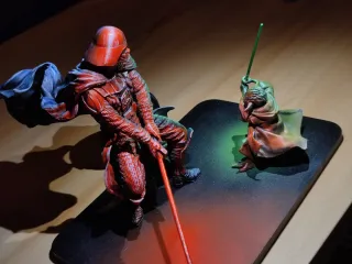 Figuras de colección de Star Wars, "what if" de Darth Vader contra Yoda, pintadas a mano. - Pintadas a mano, lo que las hace únicas. - Se pueden entregar pegadas a la base en la posición de las fotos o separadas por si se quieren colocar en una base distinta. Tamaño sin contar las espadas de luz: - Altura de Vader 15cm aprox. - Altura de Yoda 7cm aprox. - Figuras hechas de plástico PVC, pintadas con pintura acrílica. - Base hecha de madera. Escucho ofertas. Se hacen envios.