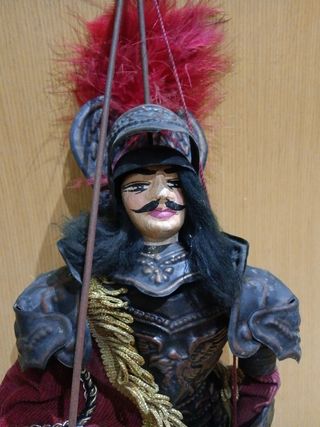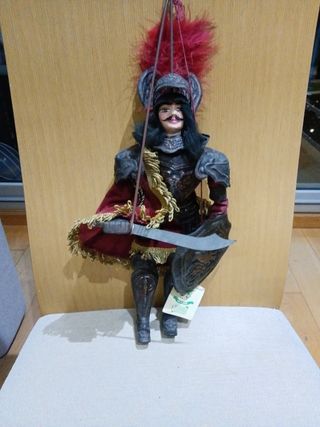 Marioneta tradicional siciliana representando a un guerrero medieval. - Detallado traje de armadura. - Capa roja con adornos dorados. - Casco con plumas rojas. - Espada y escudo.