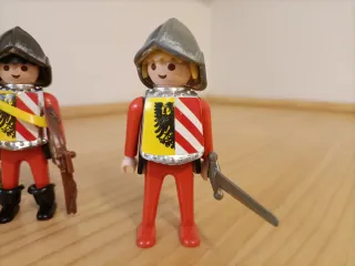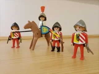 Conjunto de figuras de Playmobil. - Un caballero montado a caballo. - Tres escudero, 2 armados con espadas y escudo y uno con ballesta.