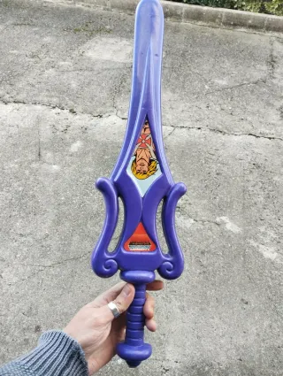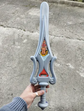 Espada de juguete vintage de Masters of the Universe, con la imagen de He-Man. - Diseño clásico de la espada. - Detalle de He-Man en la hoja. - Empuñadura con detalles. - Material de plástico.