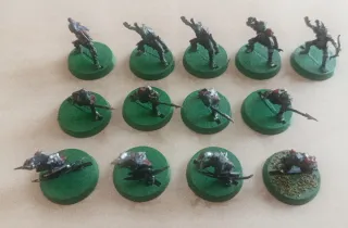 13 Orcos de Moria para el juego de mesa MESBG (El Señor de los Anillos) originales. 5 arqueros, 4 lanceros y 4 con espada y escudo (uno de ellos sin escudo) 13 miniaturas de Elfos con espada/arco (originales) Y añado 1 proxy de resina de faramir con armadura.