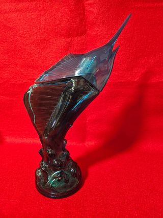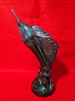 Elegante figura de pez espada frasco de perfume de cristal de Marca Avon, ideal para coleccionistas. Es una pieza única con un diseño llamativo. - Fabricada en material oscuro y brillante. - Presenta detalles intrincados en la base. - Color azul oscuro en la parte superior.