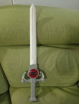 Espada del Augurio de juguete de Thundercats. 60 cm. - Fabricada en plástico resistente. - Diseño clásico de la serie animada. - Incluye detalles como el escudo con el logo de los Thundercats. - Ideal para coleccionistas. - Hacía luces y sonidos, pero no sé si ahora funciona. Le falta la tapa de las pilas.