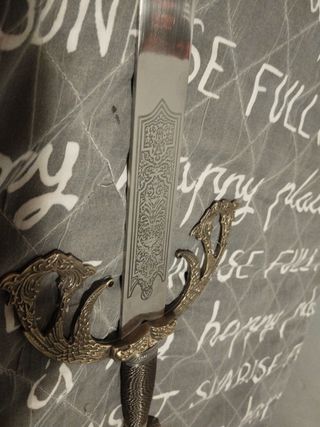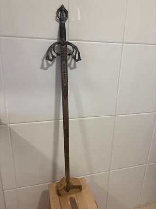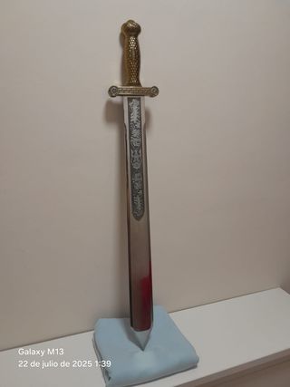 Réplica decorativa de la espada del Cid. - Diseño detallado. - Empuñadura con agarre. - Hoja metálica con inscripciones.