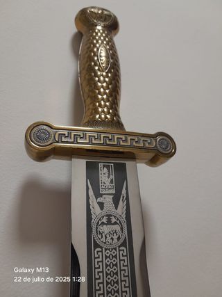 Espada decorativa fabricada en Toledo con detalles grabados. Es una pieza elegante y llamativa. - Fabricada en acero. - Sello de fabricación Toledana grabado. - Empuñadura dorada. - Grabados decorativos en la hoja. - Estilo clásico.