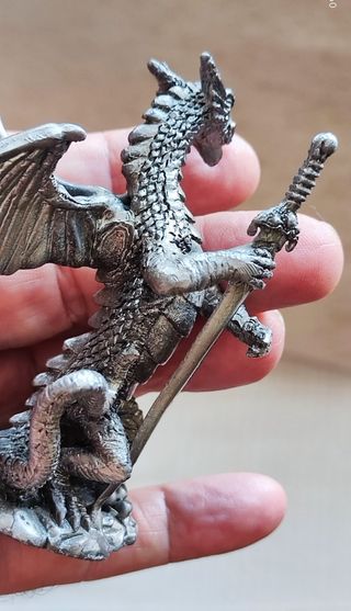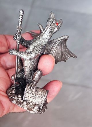 Figura de dragón de metal, muy detallada. Es una pieza única y decorativa. Con un peso de 255 gramos y unas medidas de 9,5x9,5cm - Es de metal, con un acabado plateado. - El dragón sostiene una espada. - Se posa sobre un pequeño cofre del tesoro. - Ideal para coleccionistas.