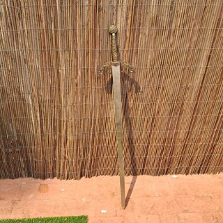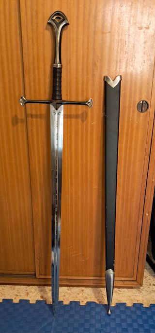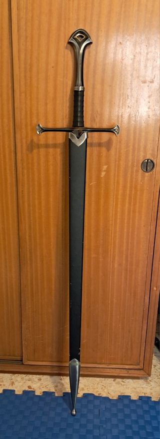 Espada Anduril, réplica de la famosa espada de Aragorn en "El Señor de los Anillos". - Réplica detallada de la espada Anduril. - Incluye funda de cuero negro. - Empuñadura con detalles metálicos. - La espada se encuentra en buenas condiciones, sólo la funda tiene algún pequeño desgaste (ver fotos). - Hoja: acero inoxidable, con runas élficas grabadas. - Longitud: 130 cm, hoja de 100 cm. - Grosor: 5 mm. - Peso: 2 km, aprox. - Incluye soporte de madera para colgaren pared.