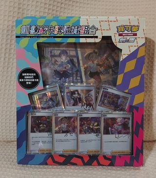 Colección de cartas de Entrenador firmadas de Pokémon de la expansión Espada y Escudo. - Incluye cartas de Entrenador. - Presenta arte de personajes como Marnie, Nessa y Raihan. - Contiene cartas de Pokémon. - Las cartas están firmadas por sus ilustradores. Idioma Chino.