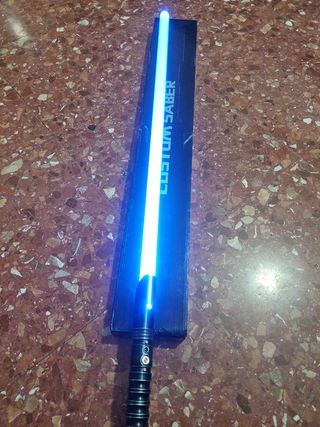 Espada láser con hoja de color azul brillante. El mango es de color negro con detalles plateados. - Hoja de LED azul. - Mango de metal negro.