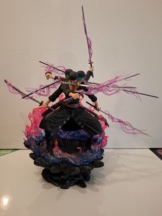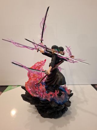 Figura de Roronoa Zoro en su forma Ashura con sus nueve espadas. La figura está detallada y representa una pose dinámica. - Diseño inspirado en el personaje de One Piece. - Base con efectos de llamas y energía. - Múltiples espadas incluidas.