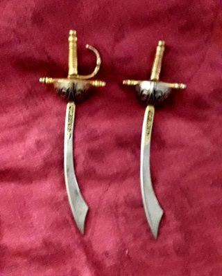 10e Conjunto de dos mini espadas decorativas que funcionan como abrecartas. Tienen un diseño elegante y detallado. (12cm) Made in Spain..Toledo - Empuñadura dorada con guarda. - Hoja curva plateada. - Base decorada con motivos grabados.
