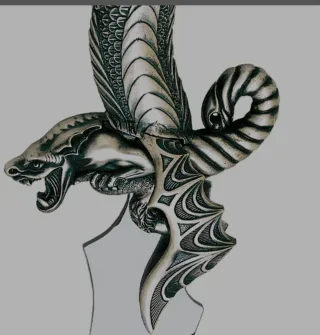 Set de espada y daga con diseño inspirado en el mago Merlín. Pieza decorativa con detalles elaborados. - Diseño de dragón en la empuñadura. - Acabado metálico plateado. - Incluye espada y daga.