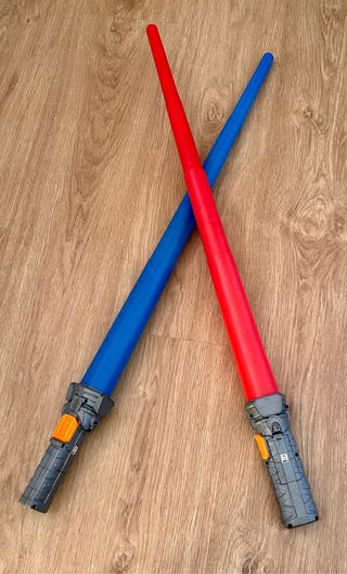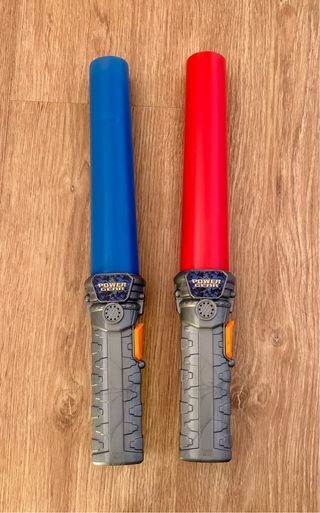 Set de dos espadas retráctiles de juguete Power Gear con luz y sonido. Funcionan perfectamente. Una de color rojo y otra de color azul. Son de los años 90. Coleccionismo colección vintage Guerra de las galaxias juego juguete reyes magos papa Noel carnaval