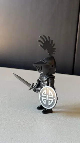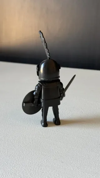 Figura de Playmobil de un caballero negro con armadura detallada. - Incluye espada. - Incluye escudo con diseño. - Casco con penacho.