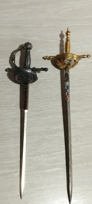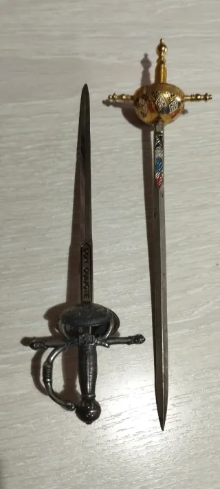 Dos espadas abrecartas con detalles ornamentales. - Una espada presenta grabados en la hoja con el texto DON QUIJOTE. - La otra espada tiene un pomo dorado con motivos decorativos y colores. - Ambas espadas son de metal.