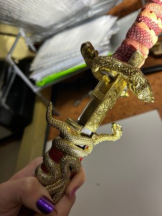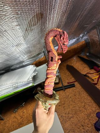 Espada decorativa con empuñadura de dragón. - Empuñadura detallada con forma de dragón rojo y dorado. - Guarda dorada con adornos. - Diseño inspirado en espadas chinas. recoger en Valencia o Madrid en mano tiene una daga y toquilla a juego