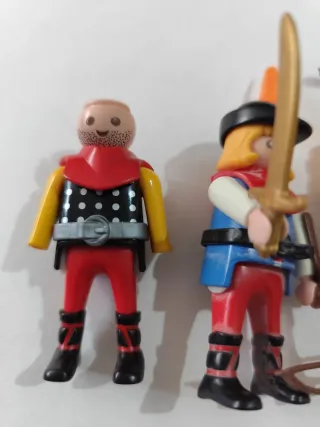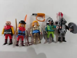 Conjunto de figuras Playmobil con temática medieval. - Incluye cinco figuras. - Accesorios como espadas, escudo y ballesta. - Figuras con armaduras y vestimenta de época.