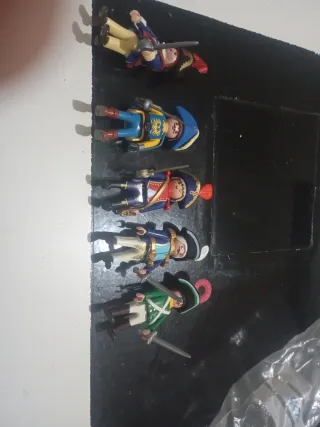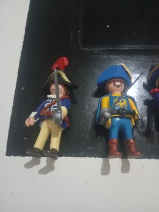 Conjunto de figuras de soldados Playmobil con vestimenta histórica. - Incluye 4 figuras. - Cada figura lleva su espada y sombrero característico. - Diseños detallados en uniformes y accesorios.