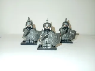 Conjunto de tres figuras de guerreros enanos con armadura, espadas y escudos. - Figuras de Lego el señor de los anillos. - Incluyen espadas, escudos y jarras.