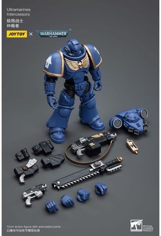 Precintado. Figura de acción Joy Toy Ultramarines Intercessor de Warhammer 40,000. Figura oficial de WH40K. Escala 1/18, 12cm. Múltiples puntos de articulación (pise, tobillos, rodillas, caderas, cintura, cabeza, hombros, codos, muñecas) para poder adoptar cualquier pose. Incluye múltiples accesorios: rifle bolter, pistola bolter, espada sierra, manos intercambiables, etc.