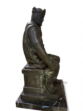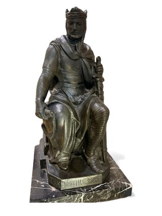 Figura de bronce de Jaime I, edición limitada. Rey Jaime I de Aragón, obra del artista Vicente Llorens Poy. Representa al monarca sentado, con corona y espada. La figura está hecha de bronce sobre una base de mármol. Es una serie limitada a 380 piezas, muchas de las cuales fueron regalos públicos debido a su alto precio. El artista, Vicente Llorens Poy, fue un reconocido pintor y escultor español.