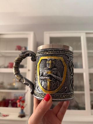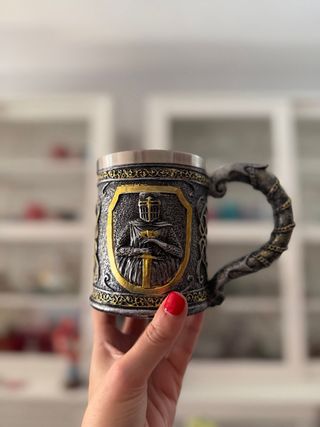 Taza con diseño medieval inspirada en caballeros templarios. Perfecta para coleccionistas o como regalo temático. - Fabricada en acero inoxidable. - Detallado relieve de caballero con espada. - Asa con diseño escamado. - Borde superior decorado.