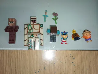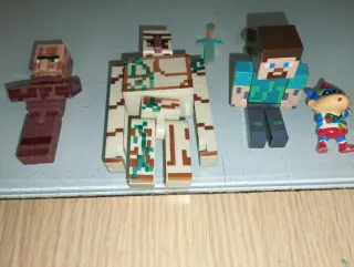 Lote de figuras de personajes de videojuegos y anime. - Figura de un aldeano de Minecraft. - Figura de un golem de hierro de Minecraft. - Figura de un personaje de Minecraft con cabeza de Steve. - Espada de Minecraft. - Flor de Minecraft. - Figura de un personaje de anime con traje azul y rojo. - Figura de un personaje de Lego. - Figura de Shin Chan.