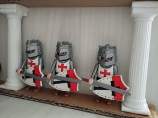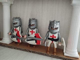 Figuras de Playmobil de Caballeros Templarios. Cada unidad incluye un caballero con su armadura, casco, escudo y espada. - Diseño de Caballero Templario. - Accesorios: escudo, casco ,cota malla pelo, cuello cota malla y espada. - 3 unidades disponibles - A 8,00€ unidad. Historia Romanos piratas Belén Vikingos Oeste Medieval Templarios