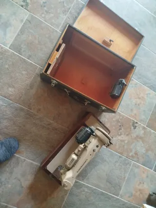 Máquina de coser Singer antigua, ideal para coleccionistas o amantes de lo vintage. Se encuentra en su maletín original. - Maletín de madera con interior forrado. - Mecanismo de sujeción interior.