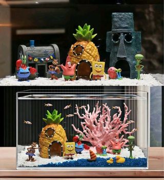 Set de decoración para acuario con personajes de Bob Esponja. Transforma tu acuario en Fondo de Bikini. - Incluye la casa de Piña de Bob Esponja. - Figuras de Bob Esponja, Patricio, Calamardo, Don Cangrejo, caracol y Arenita. - Estatua Moái. - La otra casa En total 9 piezas nuevas a estrenar Envío 5€ entrega en 7 dias pregunte Hay más accesorios que también puede incluir por un poco más pregunte!