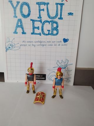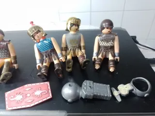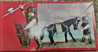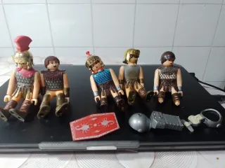 Lote de figuras de Playmobil de temática romana. Incluye cinco figuras de soldados y accesorios . - Cinco figuras de soldados romanos. - Escudo rojo con escorpión. - Cascos y armaduras. - Accesorios adicionales.