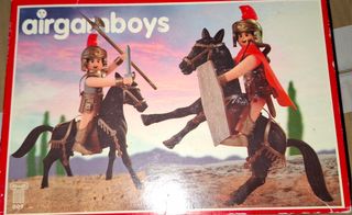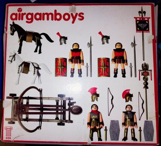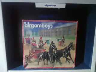 Set de Airgamboys con temática de cuadrilla romana, conservado en su caja original. - Figuras de soldados romanos y carro. - Caja con diseño de la época. - Ideal para coleccionistas.