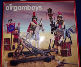 Caja de Airgamboys con temática romana, que incluye figuras y una catapulta. - Figuras de soldados romanos. - Catapulta de asedio. - Accesorios. - Caja original.