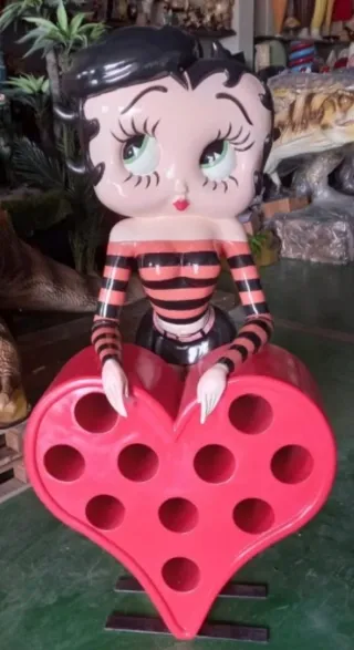 Figura decorativa de Betty Boop. - Diseño con vestido a rayas naranjas y negras. - Base roja con forma de corazón y huecos. - Adornada con flores y hojas artificiales.