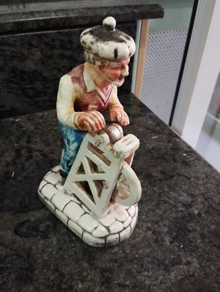 Preciosa figura decorativa de un artesano trabajando en un molino. Es una pieza única, ideal para coleccionistas o amantes de la decoración vintage. La rueda se mueve. - Figura de cerámica. - Pintada a mano. - Muestra detalles cuidados. - Perfecta para decorar cualquier espacio.