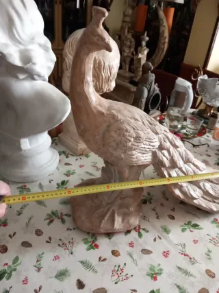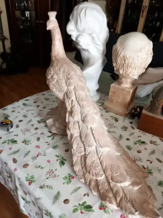 Figura decorativa de pavo real en cerámica. Ideal para añadir un toque de elegancia a cualquier espacio. - Diseño detallado de plumas. - Acabado en tono tierra.