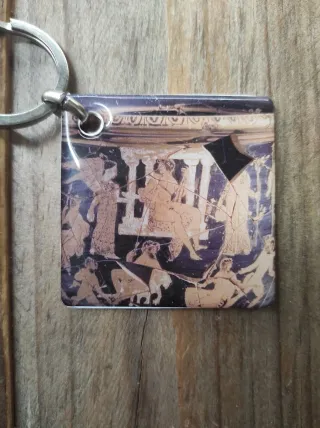 Llavero con diseño inspirado en el arte del Museo Ibero. La tienda del Museo cerró, por lo que ya no se puede conseguir de ningún modo. - Imagen de cerámica con representación de figuras antiguas. - Anilla metálica para llaves.