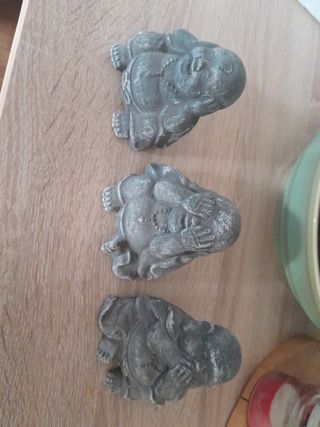 Tres figuras de budas de cerámica, ideales para decoración. Son de color gris y están en buen estado. - Tres figuras de budas. - Material: cerámica. - Color: Gris. Color: blanco