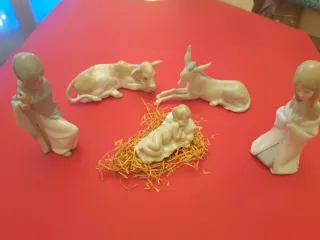 Conjunto completo de figuras para el Belén de Lladró. Incluye las piezas esenciales para recrear la escena. - Figura del niño Jesús en el pesebre. - Figura de la vaca. - Figura del burro. - Figuras de San José y la Virgen María.