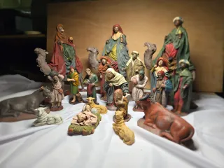 Conjunto de figuras para el Belén, representando el Nacimiento y los Reyes Magos. Figuras en buen estado Se regalan la burra y el buey , tienen defectos - Figuras detalladas. - Incluye varias piezas.