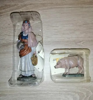 Figuras de belén de José Luís Mayo, para ediciones el Prado, representando una pastora con cántaro y cesta, y un cerdo. - Figura de pastora con atuendo tradicional. - Figura de cerdo realista.