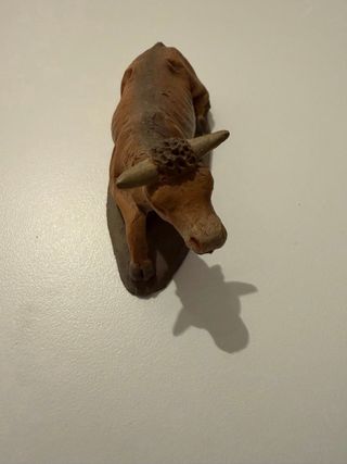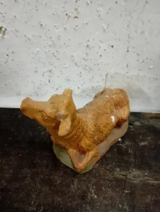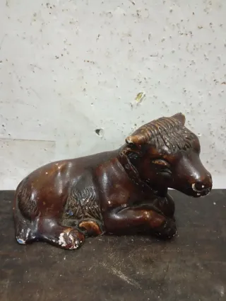 Figura de buey para belén. - Material: Barro - Color: Marrón y beige. - Base incluida. - 8cm largo - Figura buey belen año 1930 o anterior