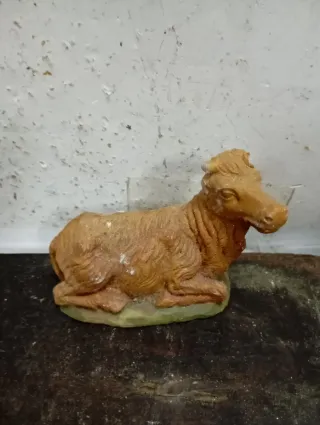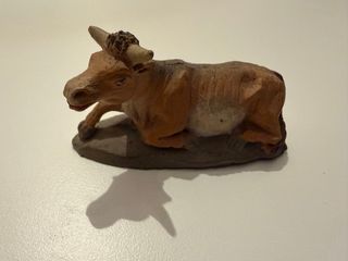 Figura de buey de resina, ideal para complementar tu belén. Con roturas y desperfectos. Mide 6x9x5. - Material: Resina. - Color: Tostado.