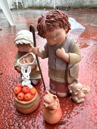 Conjunto de figuritas decorativas, ideales para un belén o para añadir un toque especial a tu hogar. - Incluye figuras de niños, animales y cesta con frutas. - Diseño detallado y acabado artesanal.