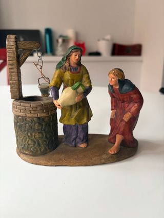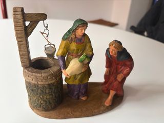 Figura de Belén que representa a una aguadera junto a un pozo. - Detalle de pozo con cubo. - Figura femenina con cántaro.