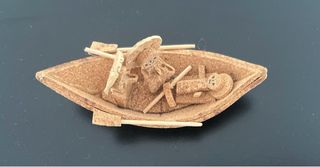 Figura de belén portugués hecha de corcho, representando el nacimiento en una barca con remos. - Material: Corcho. - Diseño artesanal. -Medidas 11x4