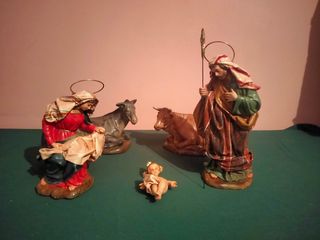 Conjunto precioso de 3 figuras del belén. Son piezas únicas, pintadas a mano con mucho detalle. El conjunto incluye: • La Virgen María con el Niño Jesús (el Niño necesita una pequeña restauración): 14cm de alto. • San José con la mula: 20cm de alto • El buey, que completa la escena del pesebre: 15x8cm Las figuras están en muy buen estado general, salvo el detalle mencionado del Niño Jesús. El material exacto no lo sé, pero son robustas y están pintadas a mano con una calidad que ya no se encuentra fácilmente.