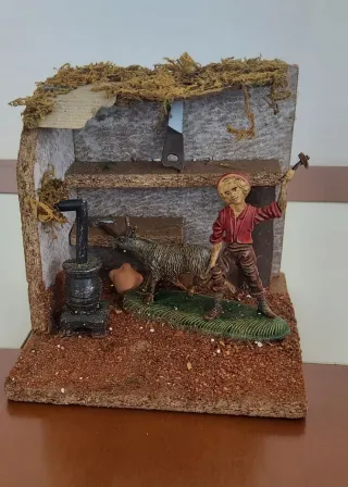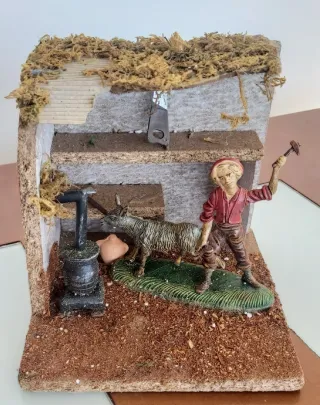 Figura de herrero para belén, ideal para completar tu escena navideña. Contiene de decoración dentro de la escena un pequeño botijo y un hacha. Es antiguo. Es de madera la herrería y los muñecos plástico. Medida 15X15 - Representación de un herrero. - Incluye un burro y un horno.